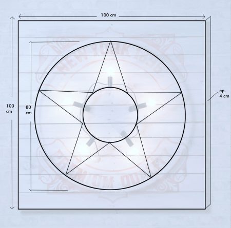 Belle lampe étoile à 5 ampoules sur panneau de bois recyclé, peinture patinée et décorée au pochoir .
