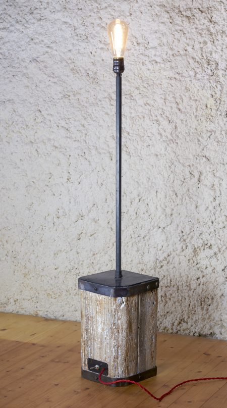 Lampe de salon à poser au sol ou sur une table basse , réalisée en bois et métal plat de 25 mm de large et 4 mm d’épaisseur ceinturant le haut et le bas d’un cube de chêne massif et un tube rond de 17mm de diamètre et 2 mm d’épaisseur .Une plaque de tôle noire de 1mm d’épaisseur recouvre le haut du cube de bois, lui-même patiné dans des tons usés de peintures de couleurs diverses .