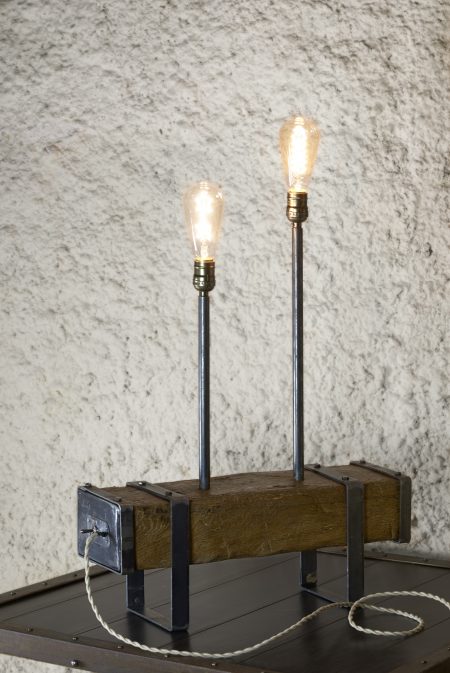 Cette lampe duo très originale apportera à votre intérieur la touche industrielle des ateliers anciens et l’ambiance feutrée de son éclairage grâce à ses ampoules Édison, à filament chaud et original. Succès Vintage authentique assuré, renforcé par la poutre de chêne massif , patinée et cirée issue de poutres centenaires de la région Champenoise.
