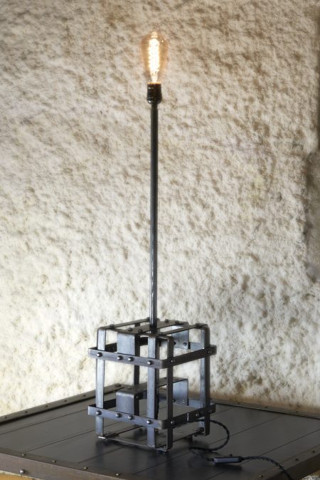 Lampe de salon à poser au sol ou sur une table basse , entièrement réalisée en métal plat de 25 et 50mm de large et 3 mm d’épaisseur riveté et tube rond de 17mm de diamètre et 2 mm d’épaisseur .